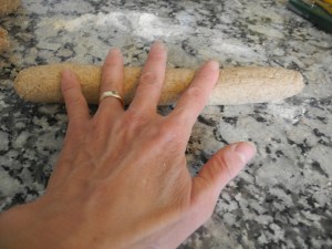 When ready, roll each ball into a thin snake just wider than your two hands. Form this into a ring and pinch to secure the ends. If using mostly white flour dough, it is helpful to wrap around your palm or wrist because the dough will be flimsy. It is a fairly straightforward process otherwise.