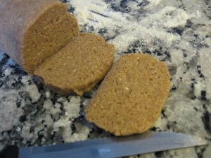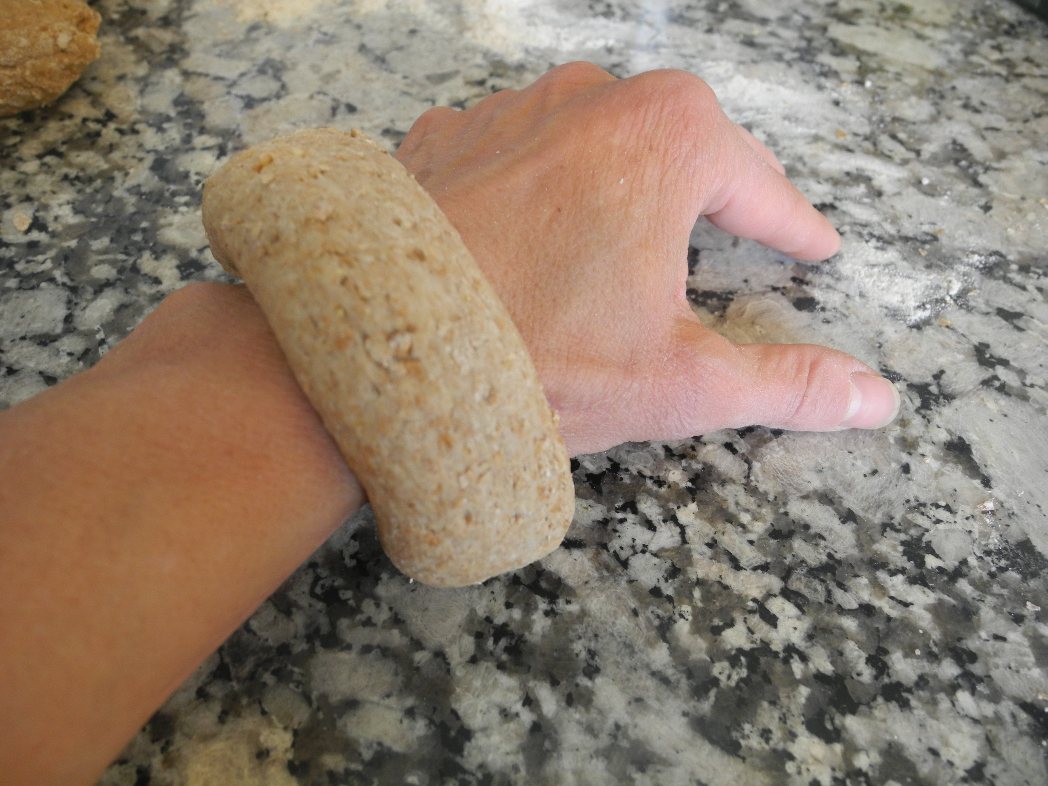 This recipe was quite simple, it completely eliminated the first step of starting the yeast in water and went right to combining it with everything (dry and wet) and mixing together to form a firm but pliable dough. I adapted this white flour recipe with a combination of whole wheat flour, bran and unbleached flour. If you are comfortable with whole wheat dough, this works just fine. After kneading the dough, it is rolled into a thin log and then formed into a circle. The recipe suggests wrapping the dough around your hand, and for a stickier white flour dough this is probably best. I used my wrist, but probably would have been fine simply making a ring with the dough. In any case, it was fairly straightforward to form rings of dough.