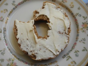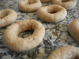 It is fascinating to me how easily one can fall into the habit of relying on others for the things we want and need. I am constantly preaching the gospel of preparing food at home, from scratch. It is the heart and soul of my cookbook and of all the classes that I teach. I even get on my soap box about the ‘lack of time’ argument, citing statistics about how many hours of television the average American watches per day (that would be 4!!!). Meanwhile, I too rely on the prepared foods of others to get me through the week. I am a tough customer, and realize how spoiled I have been living in the Midwestern mecca of sustainable, local, organic, handmade, hip and delicious. I have already suspended many core value such as buying only organic, sustainably raised whole foods, and recycling and composting all packaging and food waste. But I can only go so far. I have decided to take advantage of the time I am lucky to have to provide some of these missing items to my family by producing them myself. First item on the list: Bagels!