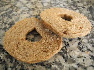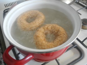 This is where the fun part comes in. After these rings rise a bit-about 20 minutes, they are dropped into boiling water. This activates the gluten in the flour, and is what creates that yummy chewy texture that is classic bagel. They need to boil on each side for about a minute. It is easy to flip them as they float on the top of the water. I realized that if I intend to do this a lot, I might need a pot that will fit more than two bagels at a time.