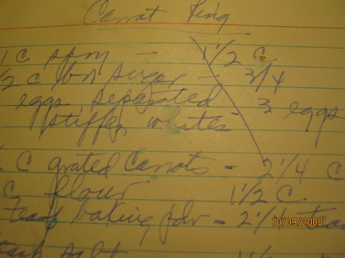 Luckily, I have in my possession 4 envelopes containing the handwritten recipes of my great Aunt Tillie, who passed away close to 20 years ago. Admittedly, most of her recipes are not exactly my style of cooking, so while I keep them safely in a drawer, I don’t pull them out often. This however turned out to be the perfect opportunity to investigate the envelope labeled “CARROTS-NOODLES-SALADS-JELLO-MOLDS”. To my great pleasure, I came across exactly what I was searching for!